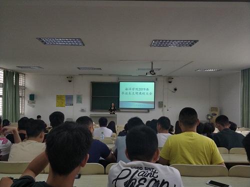 5月9日上午9点,海洋学院2019届毕业生文明离校大会于3教210顺利召开,院学工办主任李丽、团委书记郭孝伟、辅导员沈立岚,以及学院2019届毕业生出席本次大会。